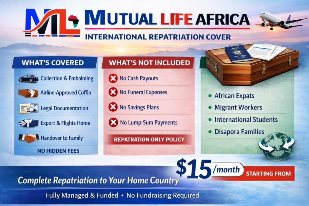 Mutual Life Africa offers dedicated International Repatriation Cover designed exclusively for African expats, migrants, and diaspora communities living in the United Kingdom, Europe, the United States, and Canada.